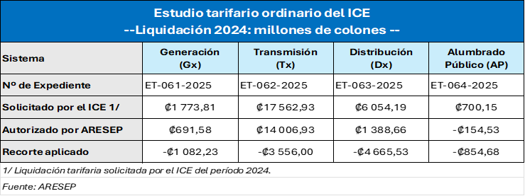 Como parte del estudio, el ICE presentó la liquidación tarifaria del período 2024 y la proyección de su estructura de costos para el 2026. En la revisión de la liquidación tarifaria del 2024, la ARESEP rechazó alrededor de ¢10.000 millones (diez mil millones) solicitados por el ICE. Los costos no aceptados fueron los siguientes: