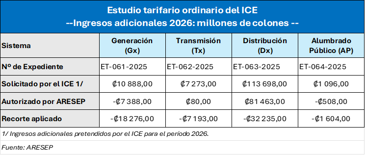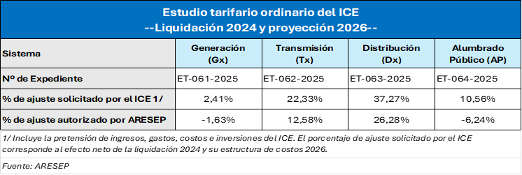 Aunque el ICE solicitó aumentos en todos los sistemas, el análisis objetivo y regulatorio de ARESEP permitió aprobar una rebaja en las tarifas de generación y alumbrado público, así como un aumento menor, al pretendido por el ICE, en las tarifas de transmisión y distribución: