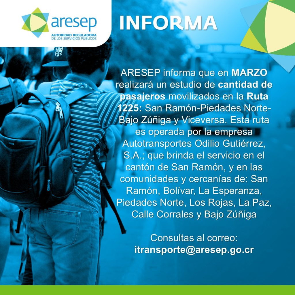 ARESEP realizará un estudio de cantidad de pasajeros para la ruta 1225 operada por la empresa Autotransportes Odilio Gutiérrez, S.A.