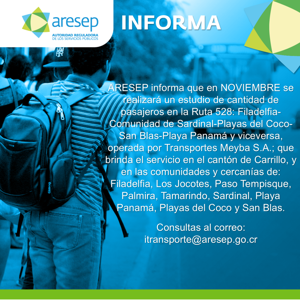 ARESEP informa que en NOVIEMBRE se realizará un estudio de cantidad de pasajeros en la Ruta 528: Filadelfia-Comunidad de Sardinal-Playas del Coco-San Blas-Playa Panamá y viceversa, operada por Transportes Meyba S.A.; que brinda el servicio en el cantón de Carrillo, y en las comunidades y cercanías de: Filadelfia, Los Jocotes, Paso Tempisque, Palmira, Tamarindo, Sardinal, Playa Panamá, Playas del Coco y San Blas.