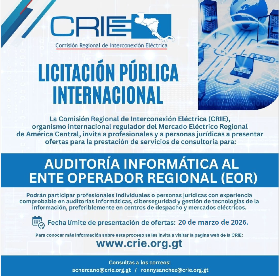 La Comisión Regional de Interconexión Eléctrica (CRIE), organismo internacional regulador del Mercado Eléctrico Regional de América Central, invita a profesionales y a personas jurídicas a presentar ofertas para la prestación de servicios de consultoría para: AUDITORÍA INFORMÁTICA AL ENTE OPERADOR REGIONAL (EOR).